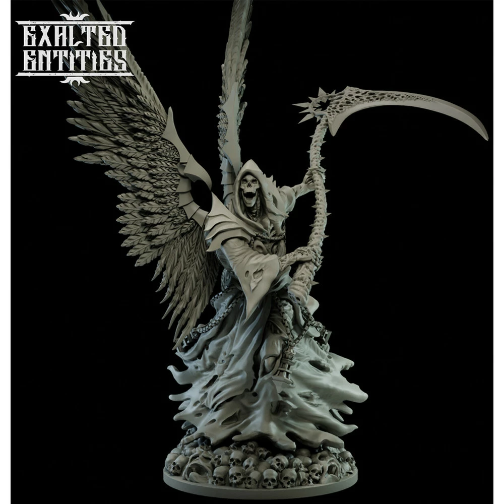 This figure kit from Dark Place Miniatures expresses the Prophet of Decay, who attacks his prey with a large sickle. This image of the God of Death is familiar to all, with the skull head inside the hood, the eerily fluttering hem of his robe, and the large wings on his back. His base is about 60mm across, and features dozens of skulls piled at his feet!